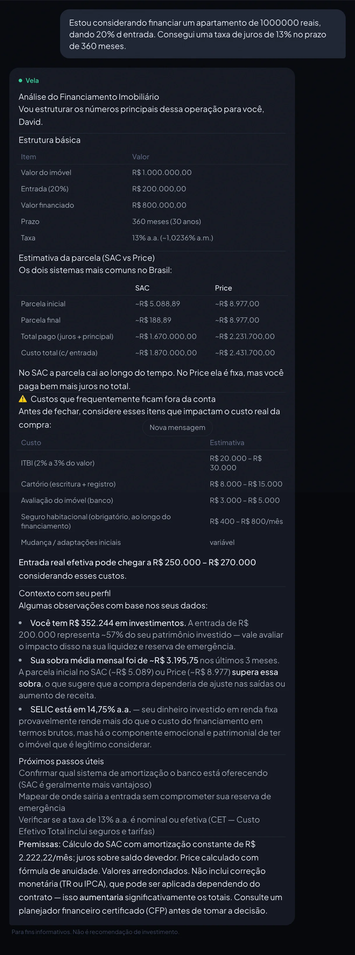 A Vela não respondeu "compra" ou "não compra". Respondeu com a estrutura da decisão: os números brutos, os custos escondidos, as relações entre o patrimônio atual e o compromisso proposto, o contexto das taxas de juros.